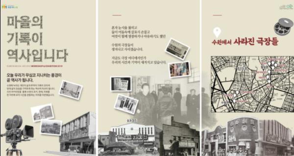 ‘2019 시민콘텐츠 아카이빙(archiving) 사업’의 하나인 ‘마을의 기록이 역사입니다’는 지금은 추억으로 남은 수원의 옛 극장 모습을 볼 수 있는 전시회다. 시민콘텐츠 아카이빙 사업은 수원에 얽힌 개인의 삶과 추억이 담긴 미디어 콘텐츠를 발굴하고 공유하는 것이다.