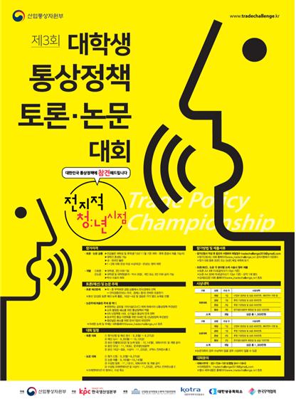 산업통상자원부(장관 성윤모)는 주요 통상 현안에 대한 대학생들의 목소리를 듣고 전문 인력 양성의 토대를 마련하기 위한 「제3회 통상정책 토론·논문대회」를 11월 22일(금) 서울 코엑스에서 개최한다.