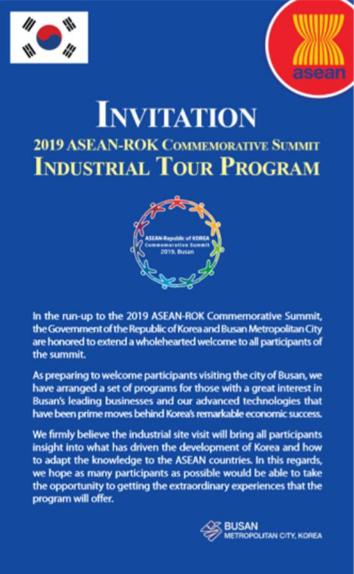 부산시(시장 오거돈)는 (재)부산경제진흥원과 함께 오는 11월 25일부터 26일까지 부산에서 개최되는 한·아세안 특별정상회의와 연계하여 부산의 역점산업을 둘러보는 산업시찰 프로그램을 운영한다고 밝혔다.