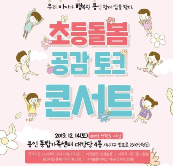 용인시는 내달14일 수지구 상현동 용인종합가족센터에서 진행하는 초등돌봄 공감 토크콘서트에 참가할 용인시민 180명을 26일부터 선착순 모집한다.