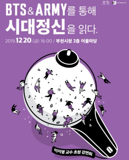 부천시가 오는 12월 20일(금) 오후 4시~6시에 시청 어울마당에서 「BTS 예술혁명」의 저자 세종대 이지영 교수를 초청해 강연회를 개최한다.