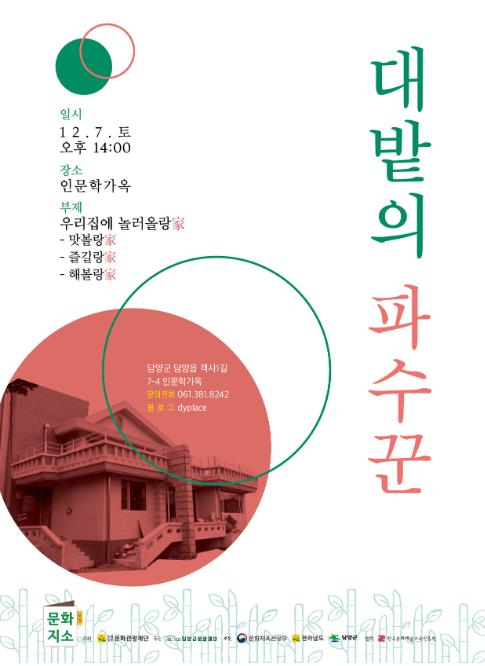 오는 12월 7일(토) 인문학가옥에서 오후 2시부터 진행되는 ‘대밭의 파수꾼’은 부제 ‘우리집에 놀러올랑가(家)’로 크게 총 3개의 프로그램인 ‘맛볼랑家’, ‘즐길랑家’, ‘해볼랑家’로 진행된다.