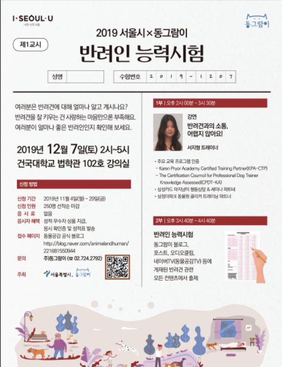 이에 반려인 능력시험은 1부 전문가 강연을 듣기부터, 2부 시험까지 포함된다. 7일 오후 2~5시까지 진행하며, 시험 문제풀이 시간은 3시 40분부터 4시 40분까지 약60분간이다.