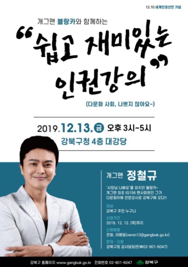 강북구(구청장 박겸수)가 세계인권선언일을 기념해 13일(금) 구청 4층 대강당에서 ‘쉽고 재미있는 인권강의’를 개최한다.