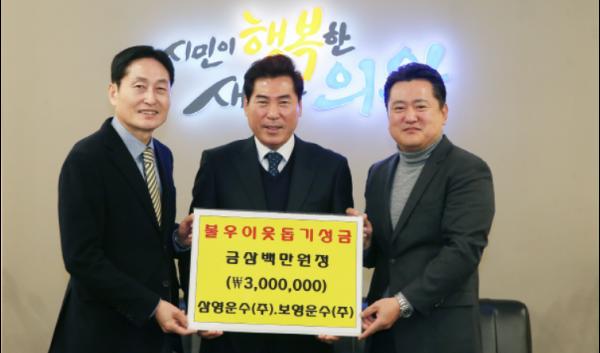 의왕시에 소재한 ㈜삼영·㈜보영운수(대표 신관선) 임직원들이 겨울을 맞아 지역의 소외된 이웃들의 따뜻한 겨울나기를 돕기 위해 지난 5일 의왕시에 이웃돕기 성금 300만원을 기탁했다.