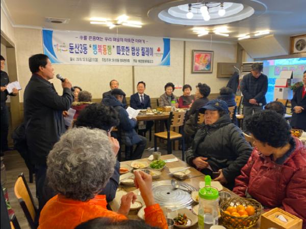 ‘행복·동행 따뜻한 밥상 릴레이’는 둔산3동 단체, 기관이 릴레이 형식으로 지역 어르신들과 오찬을 겸한 소통의 장을 마련하는 효 나눔 운동으로, 올 한 해 동안 총 9개 자생단체가 참여하여 700여 분의 어르신께 마음을 전했다.