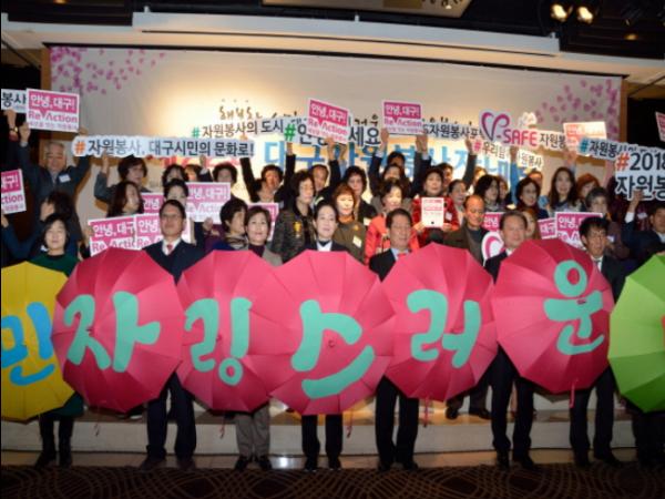 대구시는 탄탄한 자원봉사 인프라와 민관 파트너십으로 지역사회문제 해결의 동력이 되는 시민 주도의 다양한 자원봉사활동을 전개함으로써 자원봉사활동이 시민생활의 일상화가 되고 더 나아가 자원봉사가 시민의 문화로 확산되고 있다.