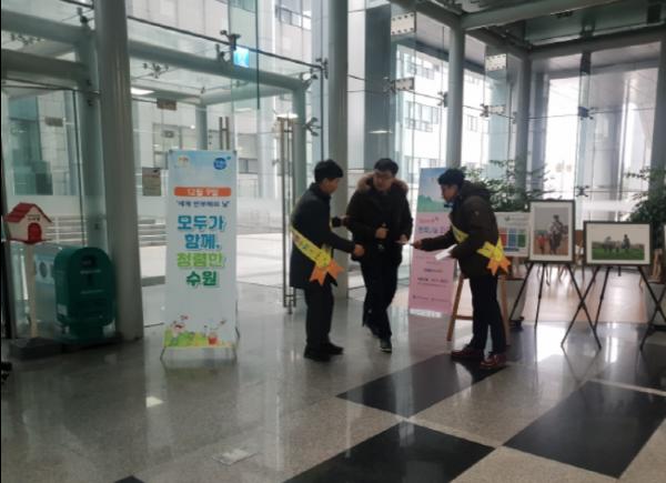 수원시가 ‘세계 반부패의 날’을 맞아 9일 시청 본관·별관 로비에서 ‘반부패·청렴실천 캠페인’을 열고, 공직자들에게 청렴한 조직문화 확산을 위해 노력해달라고 요청했다.