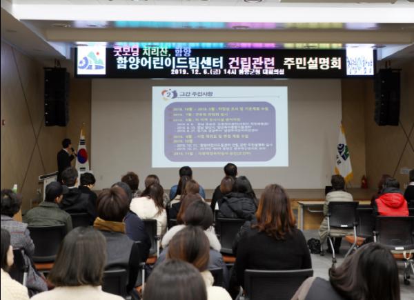 함양군은 6일 오후 2시 함양군청 2층 대회의실에서 어린이집 원장, 학부모 등 100여명이 참석한 가운데 어린이들이 행복한 함양을 만들기 위해 추진하고 있는 ‘함양어린이드림센터’건립 관련 주민설명회를 개최하였다.