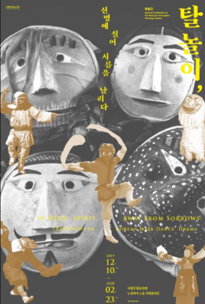 문화재청 국립무형유산원(원장 김연수)은 오는 10일부터 2020년 2월 23일까지 국립무형유산원 누리마루 2층 기획전시실(전북 전주시)에서 2019년 특별전 ‘탈놀이, 신명에 실어 시름을 날리다’를 개최한다.