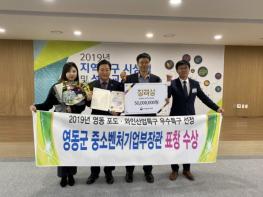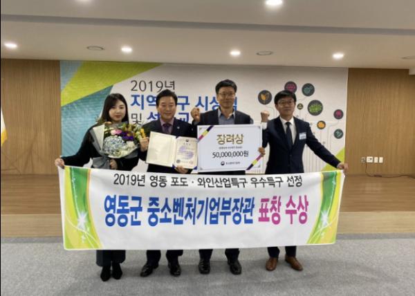 영동군은 중소벤처기업부가 주관하는 ‘2019년 지역특화발전특구 시상식 및 성과교류회’에서 영동 포도·와인산업 특구가 우수지역 특구로 선정되어 중소벤처기업부 장관상을 수상했다고 6일 밝혔다.