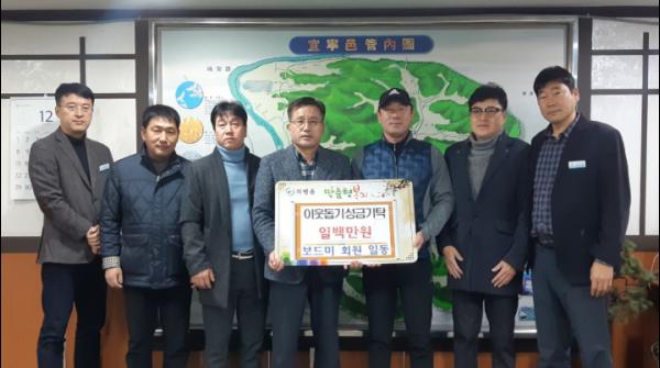 의령 보드미(회장 이재욱)는 지난 6일 연말연시를 맞아 이웃돕기 성금 100만 원을 의령읍에 기탁했다.