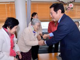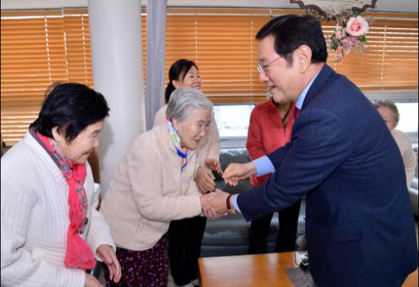 이일성로원에서 이 시장은 입소 어르신들과 인사를 나누고 추운겨울 불편한 점은 없는지 생활관, 건강기구 이용실, 황토찜질방 등 생활환경 등을 세심하게 살폈다.