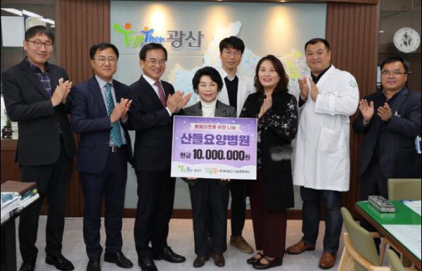 10일 광산구 산들요양병원(병원장 정성윤)이 겨울 복지사각지대 돌봄 이웃을 위해 써달라며 광산구를 통해 투게더광산 나눔문화재단에 매년 1,000만원씩 5년간 총 5,000만원을 기부할 것을 약속했다.