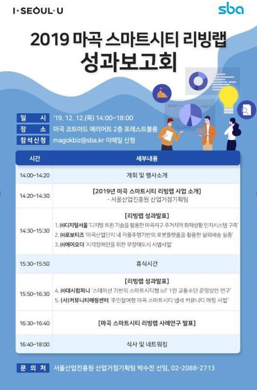 이러한 ‘마곡 스마트시티 리빙랩’ 프로젝트 결과물을 시연과 발표을 통해 시민들에게 공유하고자 오는 12월 12일 목요일 마곡 코트야드 메리어트호텔 포레스트불룸에서 성과보고회를 개최한다.