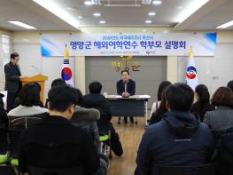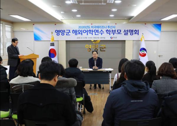 재단법인 영양군인재육성장학회(이사장 오도창)는 12월 12일 군청 소회의실에서 2020년 관내 중학생 미국 해외어학연수 시행에 따른 학부모 설명회를 개최하였다.