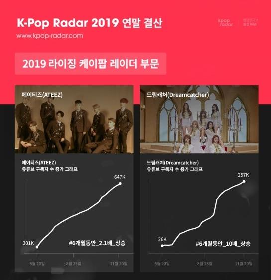 우선 에이티즈는 최근 6개월 사이에 유튜브 구독자가 2배 이상 증가하며 가파른 상승세를 보이고 있고, 드림캐쳐는 지난 5월 2만6천 명이었던 구독자 수가 최근 10배 가량 증가한 26만명까지 급증하며 2020년의 활약을 기대하게끔 했다.
