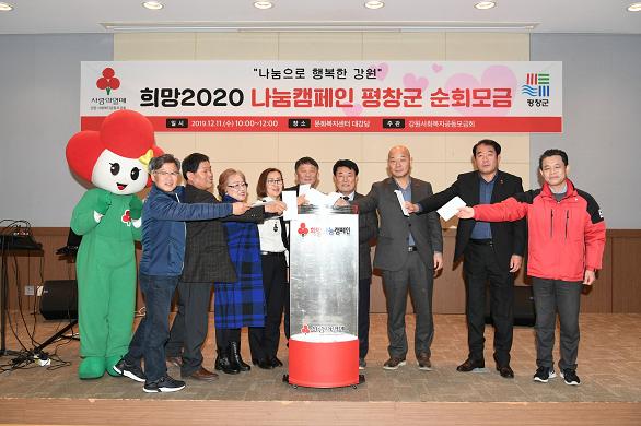 「희망2020 나눔캠페인」평창군 연합모금은 11월 20일부터 내년 1월 31일까지(73일간) 전개되며, 성금 모금에 참여하고자 하는 분은 군 주민복지과(033-330-2154) 또는 각 읍·면사무소 주민복지부서로 문의하면 된다.