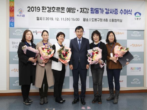 도봉구(구청장 이동진)는 12월 11일 구청 8층 소통협력실에서 2019년 환경호르몬 예방.저감 교육활동가에 대한 강사증 수여식을 개최했다.