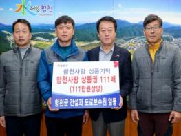 합천군청 건설과 도로보수원(반장 황주섭) 일동은 지난 12일 합천군청을 방문해 1년 동안 모은 합천사랑상품권 111매(111만원 상당)를 어려운 이웃들을 위해 써 달라며 기탁했다.