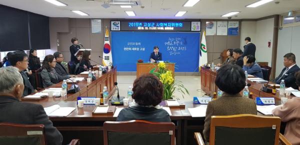 경남 고성군(군수 백두현)은 12월 11일 14시, 고성군청 3층 중회의실에서 사회복지위원회 위원 및 관계자 등 20여명이 참석한 가운데 ‘2019년 사회복지위원회’ 회의를 개최했다.