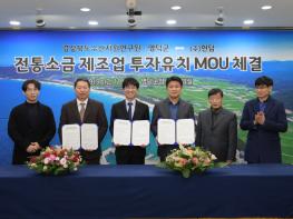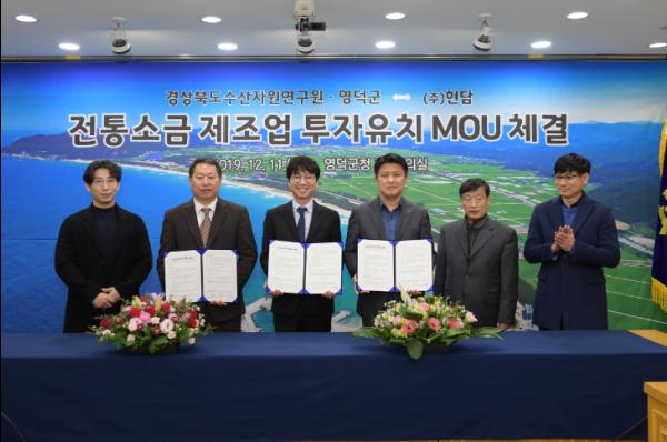 영덕군은 11일 군청 제1회의실에서 경상북도수산자원연구원.㈜현담과 총 45억 원 규모의 ‘전통소금 제조업 공장 설립’을 위한 투자유치양해각서(MOU)를 체결했다.
