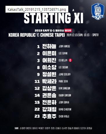 벨 감독은 중국전과 마찬가지로 4-3-3 포메이션을 꺼냈지만 선수 구성은 완전히 바뀌었다. 선발 11명 전원을 교체한 것이다. 17일 열리는 일본과의 3차전을 데뷔해 로테이션을 실행하는 것으로 보인다. 전하늘(수원도시공사)과 추효주(울산과학대)는 이번 대만전을 통해 A매치 데뷔전을 치르게 됐다.