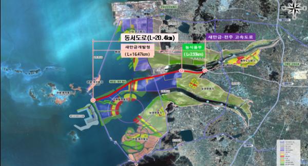 지난 2015년 착공한 동서도로는 새만금 방조제를 제외하고 새만금 지역 내에서 최초로 완성되는 간선도로이며, 동서도로가 개통되면 새만금 내부 매립공사를 위한 접근로 역할을 하게 되어 새만금 개발여건이 크게 개선될 전망이다.