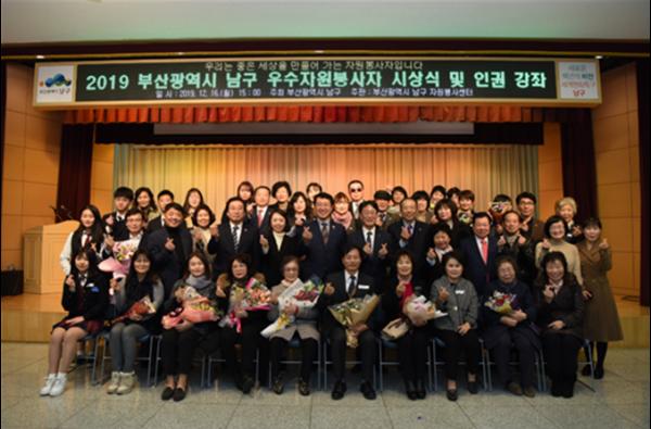 부산 남구 자원봉사센터(센터장 황영식)는 지난 12월 16일(월) 남구청 대강당에서 자원봉사자 등 기관 단체 내외빈 등 300여명이 참석한 가운데 2019 우수자원봉사자 시상식 및 인권 강좌를 개최하였다.