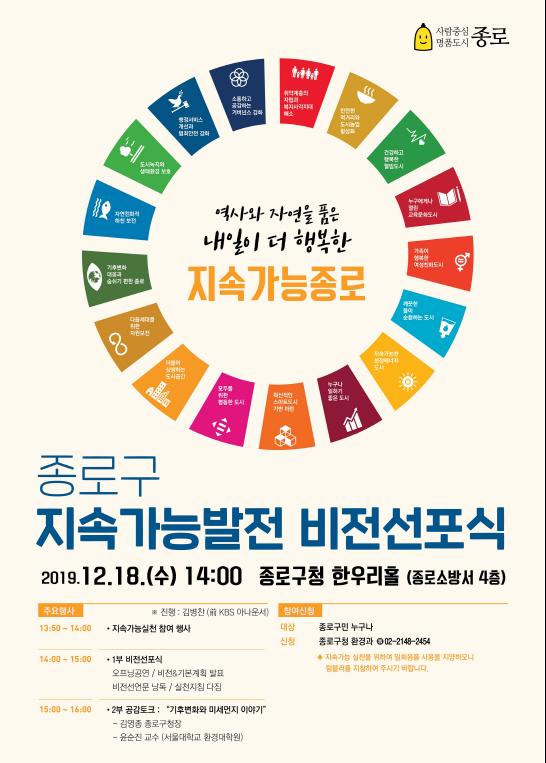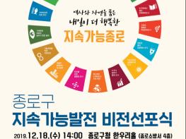 종로구(구청장 김영종)는 12월 18일(수) 오후 2시, 종로구청 한우리홀에서 ‘지속가능발전도시 종로’의 조성 의지를 알리기 위한 「지속가능발전 비전선포식」 을 개최한다.