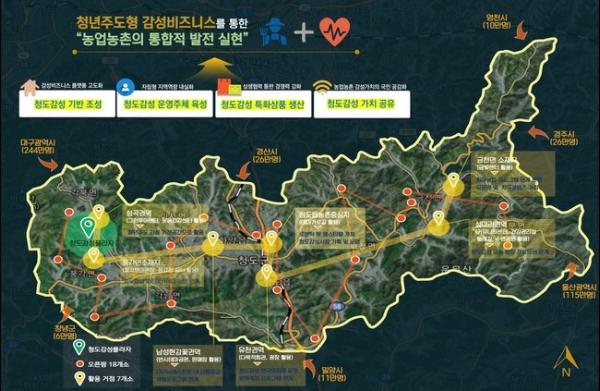 침체된 성곡권역을 리뉴얼하고 권역별 오픈팜을 지정하는 ‘청도감성 기반조성사업’, 귀농인턴십과 디자인스쿨, 열린아카데미 운영의 ‘청도감성 운영주체 육성사업’, 키자니아 직업체험, 다이닝레스토랑과 치유농장을 운영하는 ‘청도감성 특화상품 생산사업’,홍보마케팅을 위한 미디어제작과 팜파티를 개최하는‘청도감성 가치 공유사업’의 4가지 청도감성 비즈니스를 통해 청도의 농업농촌 가치를 더욱 높일 계획이다.