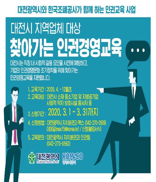 대전시는 4월부터 연말까지 대전 소재 중소기업과 지방공기업, 사회적 약자 보호시설 종사자 등을 대상으로 찾아가는 인권경영교육을 실시한다고 4일 밝혔다.