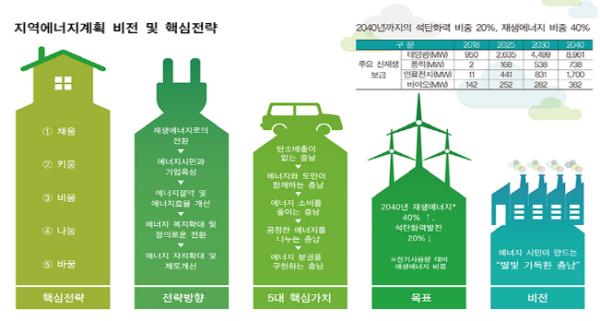 이에 도는 이번 지역에너지계획을 통해 ‘에너지 시민이 만드는, 별빛 가득한 충남’이라는 비전 아래 2040년까지 재생에너지 비중을 40%(2018년 기준 15.6%) 이상 높이기로 했다.