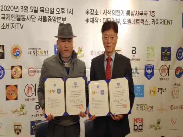 이날 국제엔젤봉사단 8대 후원회장 곽정일(불륨인 대표이사)의 취임패 전달식이 있었으며 이어서 언론사인 포탈뉴스 대표 최태문, 방송사인 NTV 총괄국장 고훈과 상호협력 협약식(MOU)가 있었다.