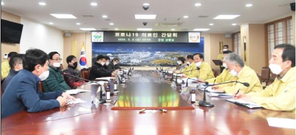 거창군은 지난 6일 코로나19의 지역사회 감염 방지와 의료 전문가 의견 수렴, 단체별 봉사 지원 방안을 모색하기 위해 군 관계자와 5개 의료단체 간부진 20명이 참석한 가운데 군청 상황실에서 간담회를 개최했다.