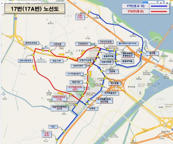 또한 오는 23일부터는 등교시간(8~9시)에 새롭게 개교하는 고촌고등학교와 고촌읍 신곡 6지구를 연결하는 등교노선 17A번이 운행될 예정이다.