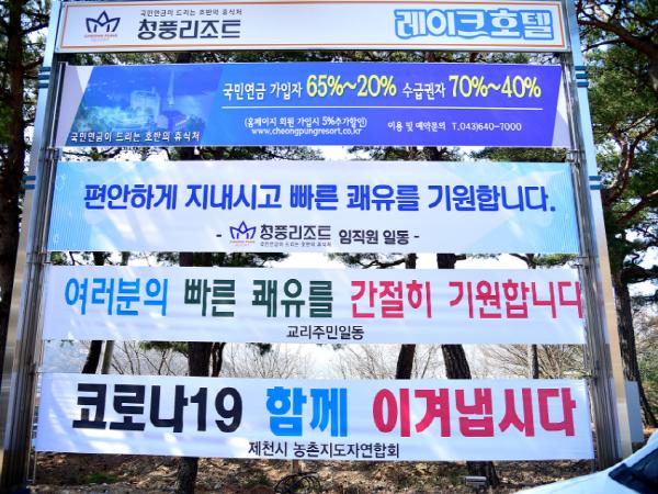 현수막에는 ▲우리는 모두 대한민국 국민입니다. 힘내세요! 모두가 함께 이겨냅시다(청풍명월 번영회) ▲청풍은 여러분의 행복한 미래를 응원합니다(주민자치위원회)