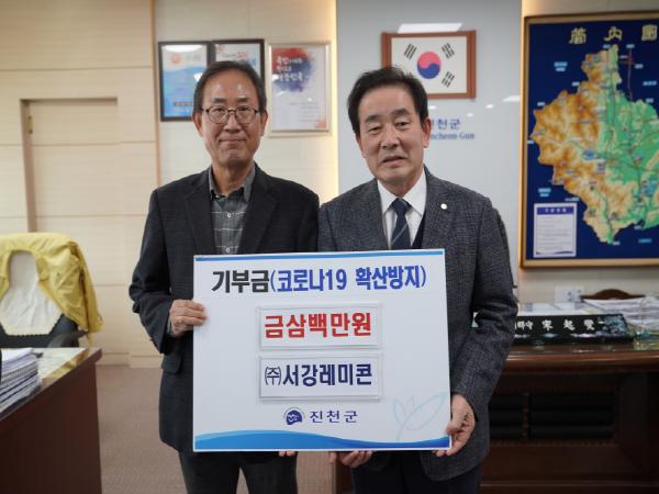 진천군 이월면 소재 ㈜서강레미콘은 9일 진천군청을 찾아 코로나19로 인해 어려움을 겪고 있는 이웃들을 위해 사용해 달라며 성금 300만원을 전달했다.