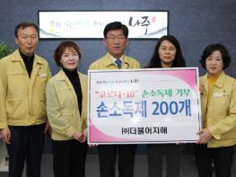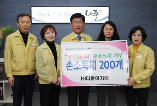 나주시는 9일 지역 예비사회적기업인 ‘㈜더불어지애’(대표 강세진)에서 코로나19 감염증 예방을 위한 손소독제 200개를 기탁해왔다고 밝혔다.
