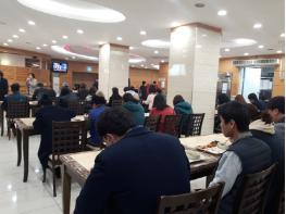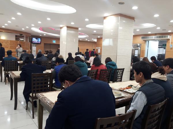 구내식당 ‘일렬로 앉기’는 구내식당 좌석을 마주보고 앉지 않도록 하여 직원간의 접촉을 최소화하기 위한 조처이다. 이에 점심시간에 좌석이 부족하여 직원들의 불편도 따르지만, 코로나19 극복을 위해 식당 줄서기를 자제하고, 구내식당 운영시간을 30분 앞당겨 부서별 탄력적으로 이용하고 있다.