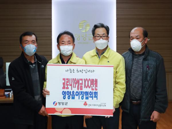 영양읍이장협의회(회장 정휘대)에서는 지난 3월 9일 영양군청을 방문하여 100만원의 성금을 기탁하며 코로나19 극복에 동참하였다.