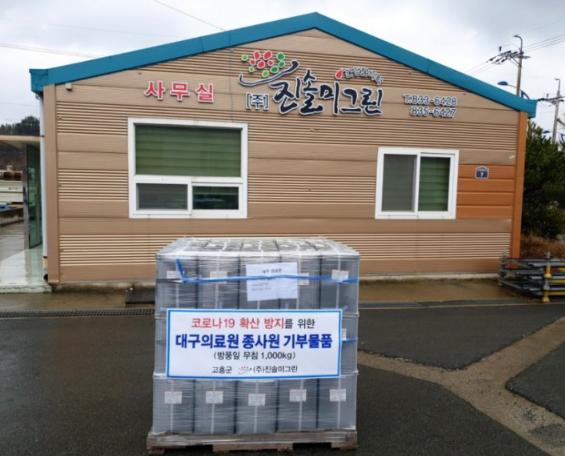 고흥군(군수 송귀근)은 10일 동강면 청정식품단지에 소재한 ㈜진솔미그린이 코로나19 확진자들을 진료하는 의료종사원들을 격려하기 위해 국내산 방풍 잎 무침 1,000kg을 전달해 훈훈한 미담이 되고 있다.