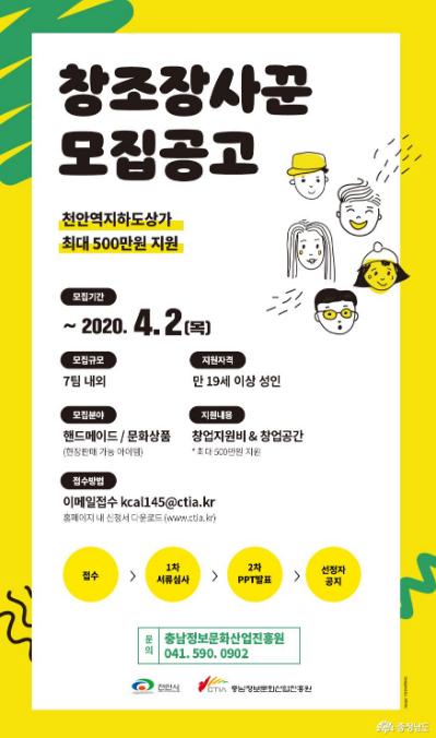 천안시와 충남정보문화산업진흥원(원장 맹창호, 이하 진흥원)은 ‘창조장사꾼 프로젝트’ 참여자 공모기간을 4주 연장한다고 10일 밝혔다.