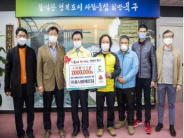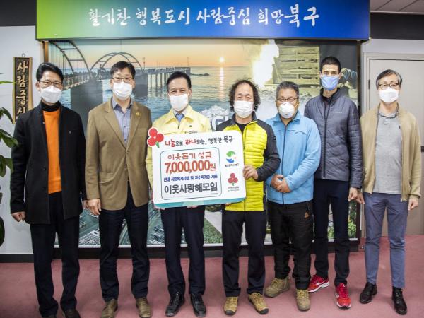 이웃사랑해모임(회장 이상근)은 지난해 12월 마지막 주와 올해 1월 둘째 주 북구 천곡동 대동아파트 앞에서 군고구마를 판매했다. 총 10일 동안 군고구마를 판 수익금을 지역 8개 복지시설 및 취약계층에 전달하기로 하고 이날 700만원을 이동권 구청장에게 전달했다.