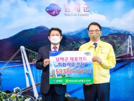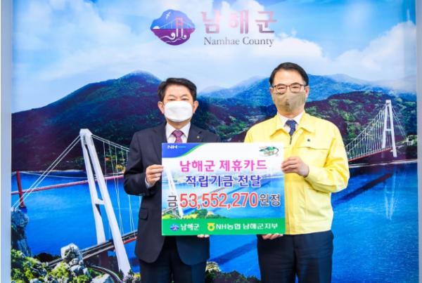 이날 전달된 기금은 남해군과 농협 남해군지부가 체결한 약정에 따라 보물섬남해사랑카드, 공무원복지카드, 보조금카드 등 5종의 제휴카드 이용실적에 따라 일정 비율의 금액을 2019년 한 해 동안 적립한 것이다. 이번 적립기금은 전년도보다 750만원(16%) 증가한 총 53,552,270원이다.