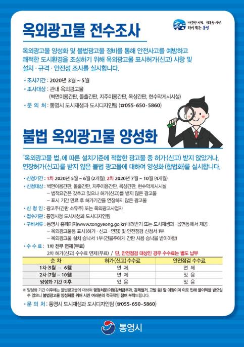 통영시(시장 강석주)는 3월부터 10월까지 관내 옥외광고물의 체계적인 관리와 안전사고 예방을 위하여 옥외광고물 전수조사와 양성화 기간을 운영한다.