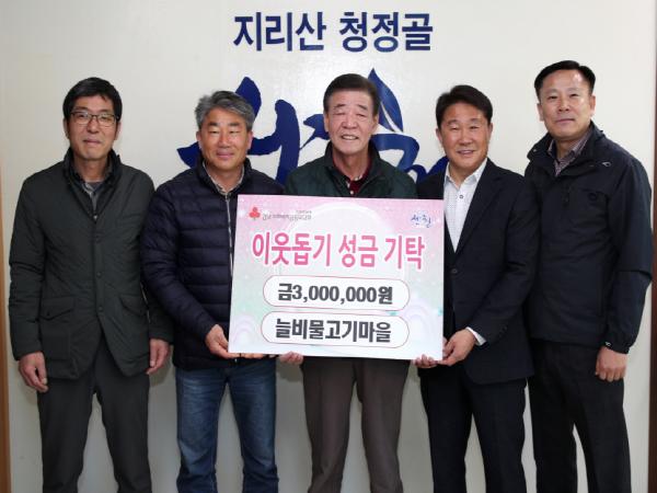 산청군 생초면의 마을권역 체험마을인 늘비물고기마을(위원장 박정수)이 11일 이웃돕기 성금 300만원을 산청군에 기탁했다.