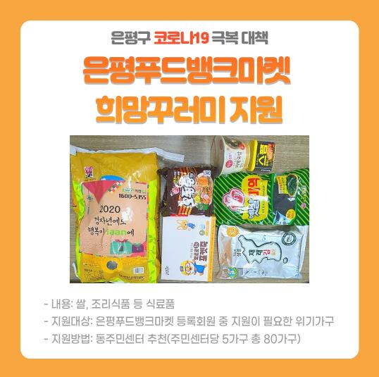 먼저 식품 지원이 시급한 푸드마켓 이용자 중 위기가정 총 80가구를 선정해 백미 10Kg,, 라면, 참기름 등 10가지 품목으로 ‘꾸러미’를 만들어 지원한다. 은평 푸드뱅크마켓에서 동주민센터로 꾸러미를 전달하면 장애인 또는 생계를 위해 꼭 지원이 필요한 이용 대상자에게 배달 된다. 자가격리 대상자는 서울형 긴급복지 지원사업으로 물품과 주거비, 생계비 등을 지원 한다.