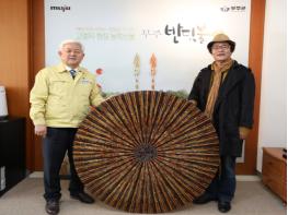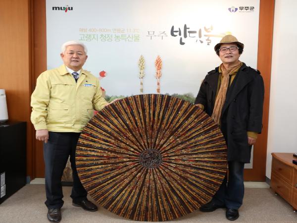 무주군 설천면 출신 목지공예 명인 박주용 작가가 13일 무주군에 “천년을 기다려온 통일의 빛(2015년)‘이라는 작품(지름 120cm)을 기증했다.