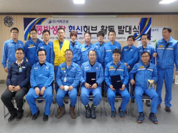 이날 발대식에는 광양 동반성장 혁신허브 추진위원과 최동익 서희건설 소장, 강진구 설비기술부 리더 등 40여 명이 참석해 올해 동반성장 혁신허브 활동을 성공적으로 수행하기 위한 결의를 다짐했다.